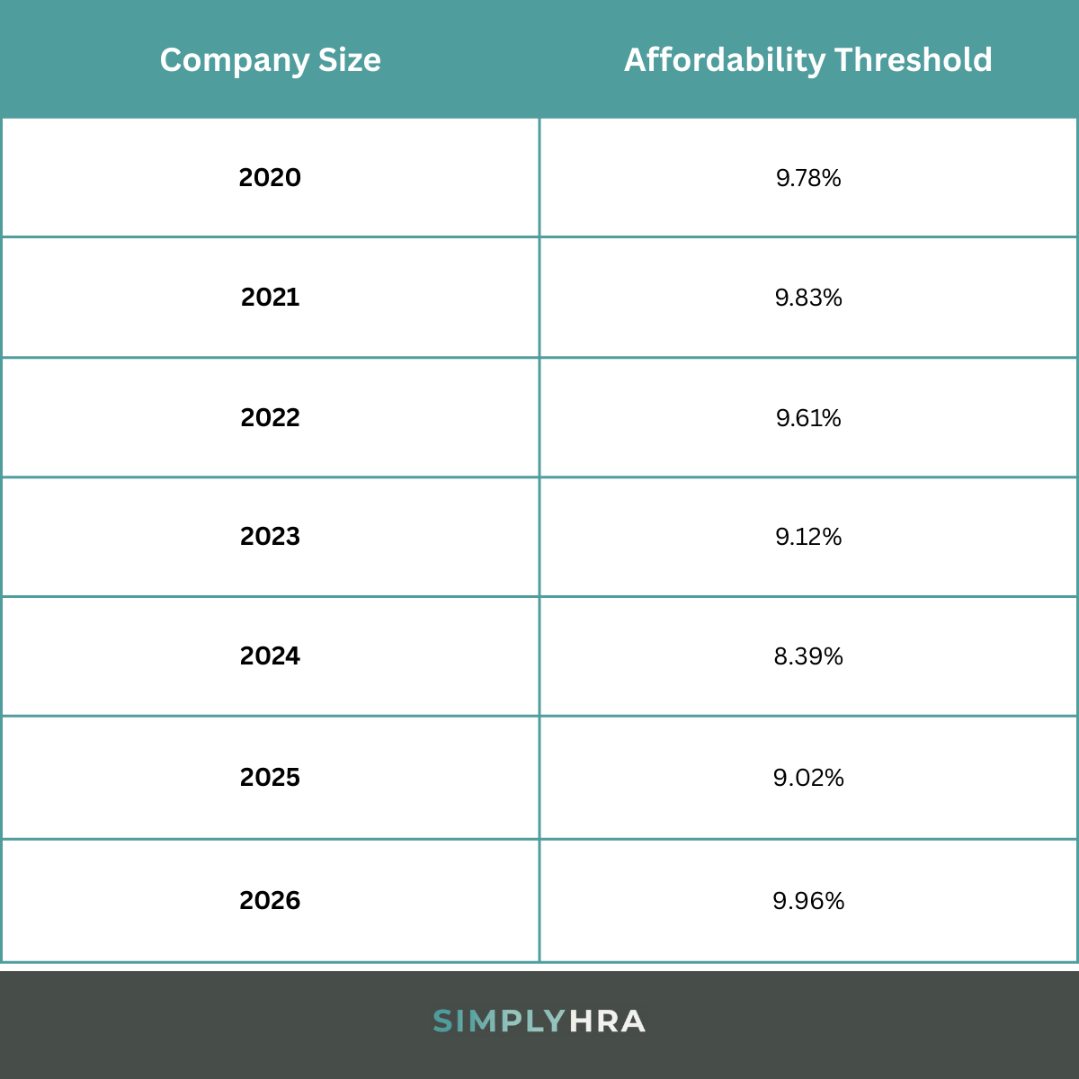 - ACA affordability threshold: Under the affordability rule, employee contributions for plan year 2026 should not exceed 9.96% of their household income.