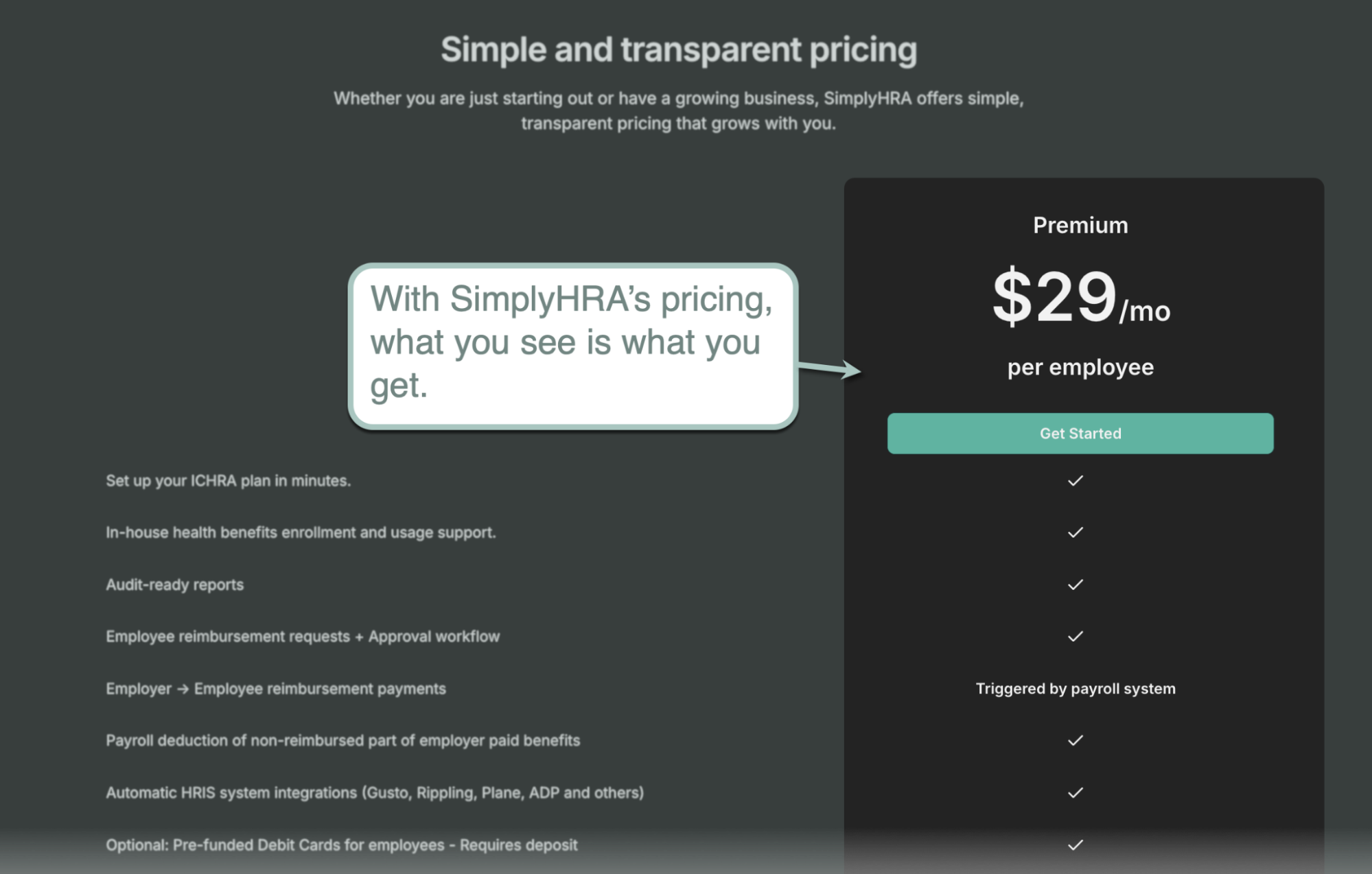 You don't have to worry about setup fees or subscription payments. You only need to pay $29 per employee per month to access all of SimplyHRA's features, services, and priority support channels.