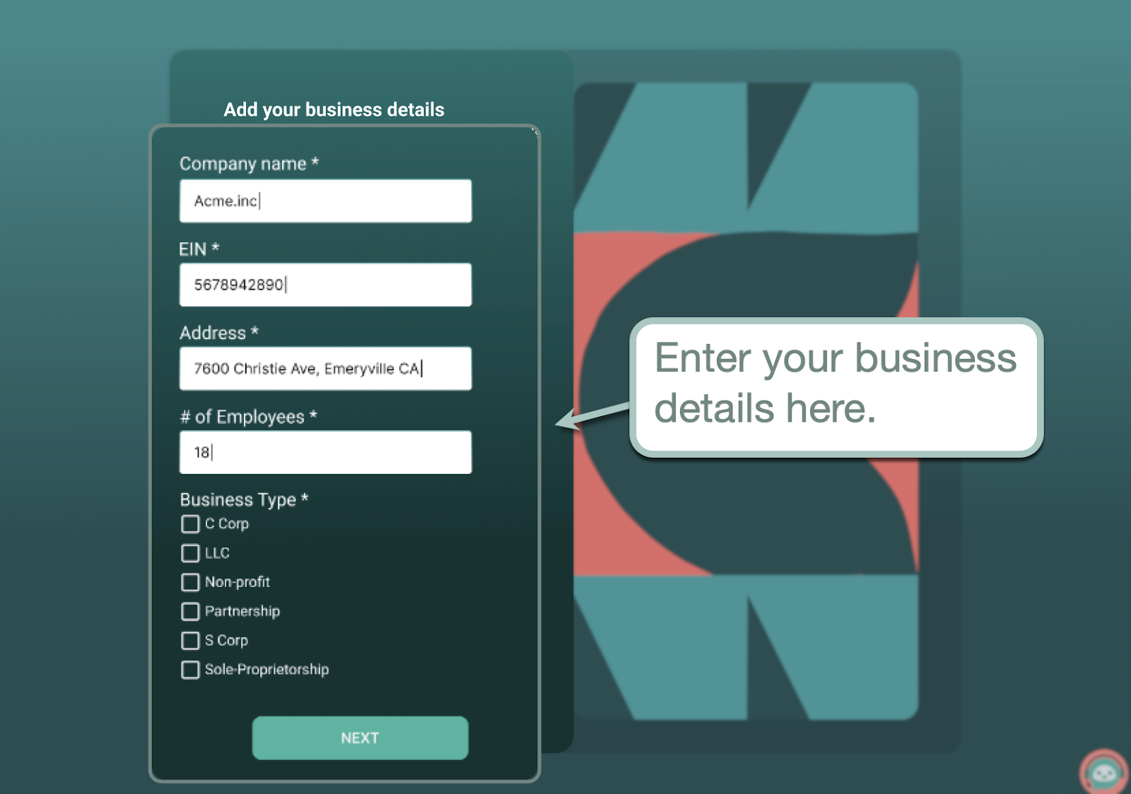 The initial setup process only involves entering essential details about your business, like your registered company name, EIN, address, and business type.